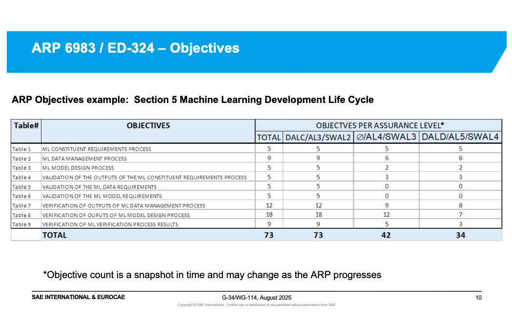 To illustrate what that looks like in practice, the draft ARP 6983 / ED-324 defines explicit objectives for every phase of the Machine Learning Development Lifecycle (MLDL). Each assurance level has its own set of mandatory objectives and distinct assurance checkpoints.